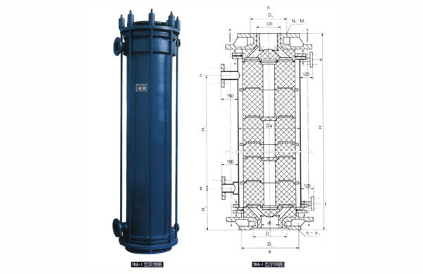 YKA型圓塊式石墨熱交換器以圓柱 體型單元積木式疊裝而成,結(jié)構(gòu)強(qiáng)度高,石墨件間墊以四氟質(zhì)或特種橡膠質(zhì)等質(zhì) 地密封件.密封可靠,設(shè)備導(dǎo)熱效率高,耐溫、抗沖擊、耐壓等性能優(yōu)越。本型設(shè)備分成I型與II型,I型載熱體切向進(jìn)入換熱塊,相鄰兩塊方向錯(cuò)開(kāi),縱向物料經(jīng)短 通逐塊再分配而紊流效應(yīng)顯著,下封頭附 加氣液分離的則成冷凝器,若上封頭改成 蒸發(fā)室則形成蒸發(fā)器。YKA-II型載熱體徑 向進(jìn)入換熱塊,殼體按外折